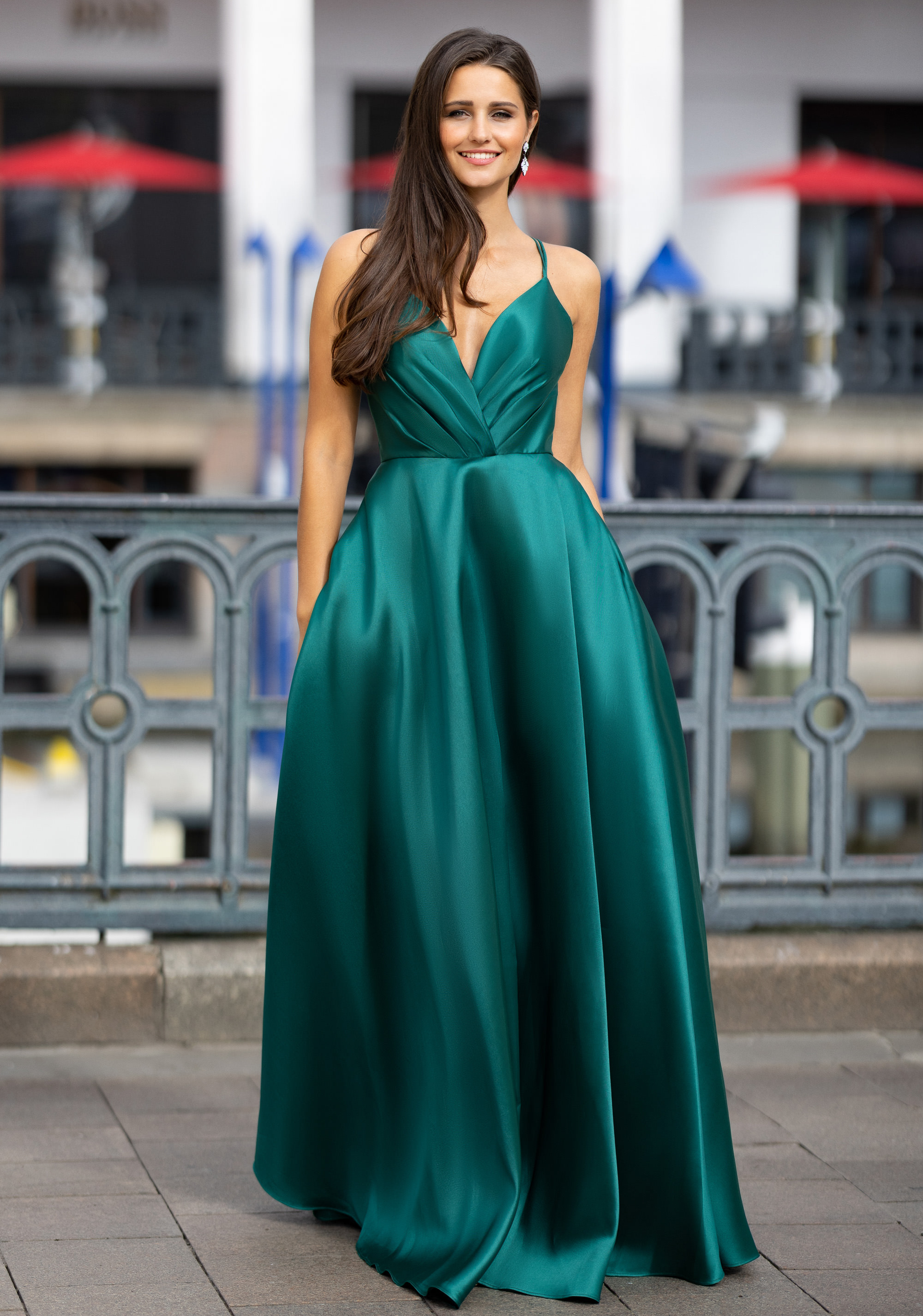 Flared Mikado evening dress in Posy Green